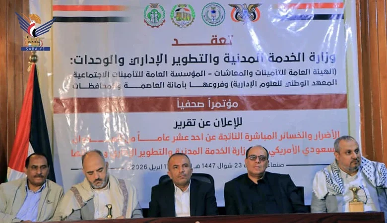 نظّمت وزارة الخدمة المدنية والتطوير الإداري، والوحدات (الهيئة العامة للتأمينات والمعاشات، والمؤسسة العامة للتأمينات الاجتماعية، والمعهد الوطني للعلوم الإدارية) ، مؤتمرًا صحفيًا للإعلان عن تقرير الأضرار والخسائر المباشرة الناتجة عن أحد عشر عامًا من العدوان على اليمن.