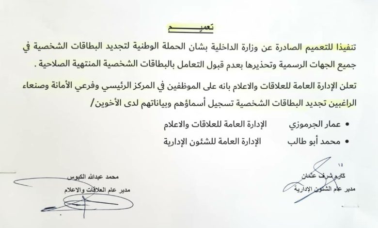 في إطار تنفيذ التعميم الصادر عن وزارة الداخلية بشأن الحملة الوطنية لتجديد البطاقات الشخصية، وتحذيرها بعدم قبول التعامل بالبطاقات المنتهية الصلاحية في مختلف الجهات الرسمية،