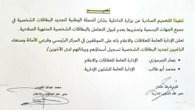 في إطار تنفيذ التعميم الصادر عن وزارة الداخلية بشأن الحملة الوطنية لتجديد البطاقات الشخصية، وتحذيرها بعدم قبول التعامل بالبطاقات المنتهية…